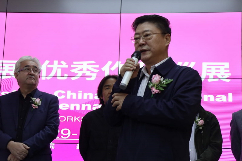 ▲新疆艺术学院院长莫合德尔·亚森讲话并宣布展览开幕