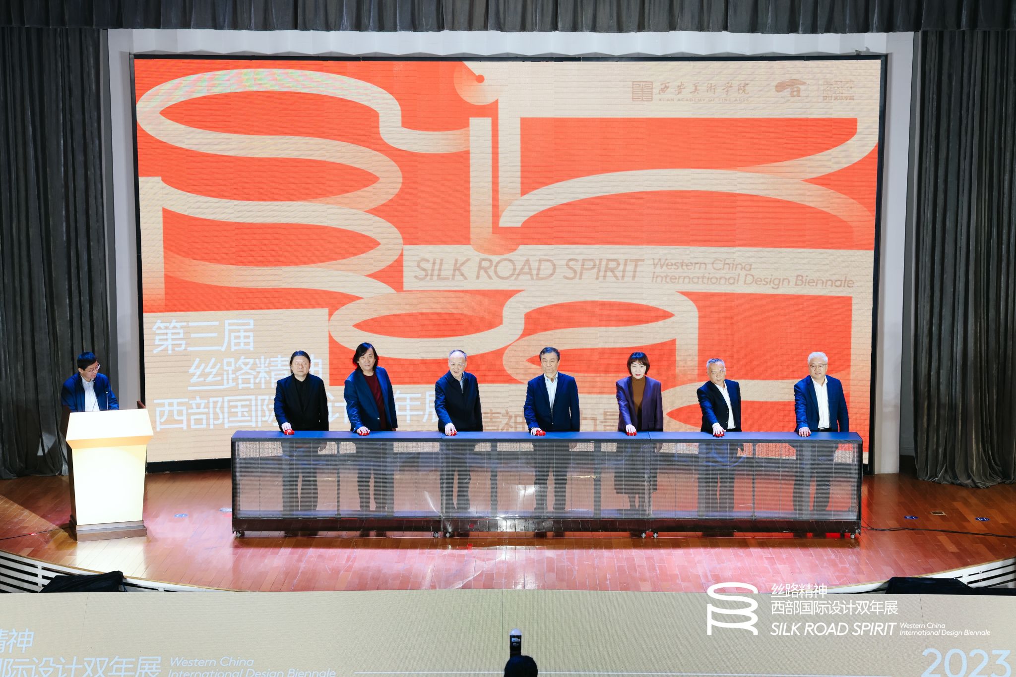11月2日, 第三届“丝路精神—西部国际设计双年展”主旨论坛在西安美院美术馆A馆开幕。中国文化艺术发展促进会公共艺术专业委员会副主任、中国高教学会设计专业委员会副主任赵健,中国美协平面设计艺委会秘书长、山东省广告协会副会长苗登宇,教育部艺术教育委员会委员、教育部高等院校设计学类教育指导委员会副主任委员郭振山,陕西省文联党组成员、专职副主席蔺雨,省教育厅二级巡视员董侠,省文旅厅二级巡视员李海荣,省政协文化文史与学习委员会副主任、省美术家协会主席郭线庐等领导和嘉宾出席此次论坛启幕仪式。学院党委书记李智军,院长朱尽晖,副院长张浩、武小川出席启幕仪式,启幕仪式由副院长屈健主持。